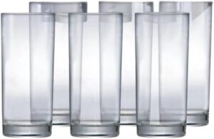 Jogo de 6 copos multiuso (tipo Nadir ou Duralex) que serve para água, suco, vinho, cerveja — qualquer coisa. Ocupa 1/4 do espaço, vai na lava-louças sem medo, não quebra fácil, e você realmente usa todos os 6.